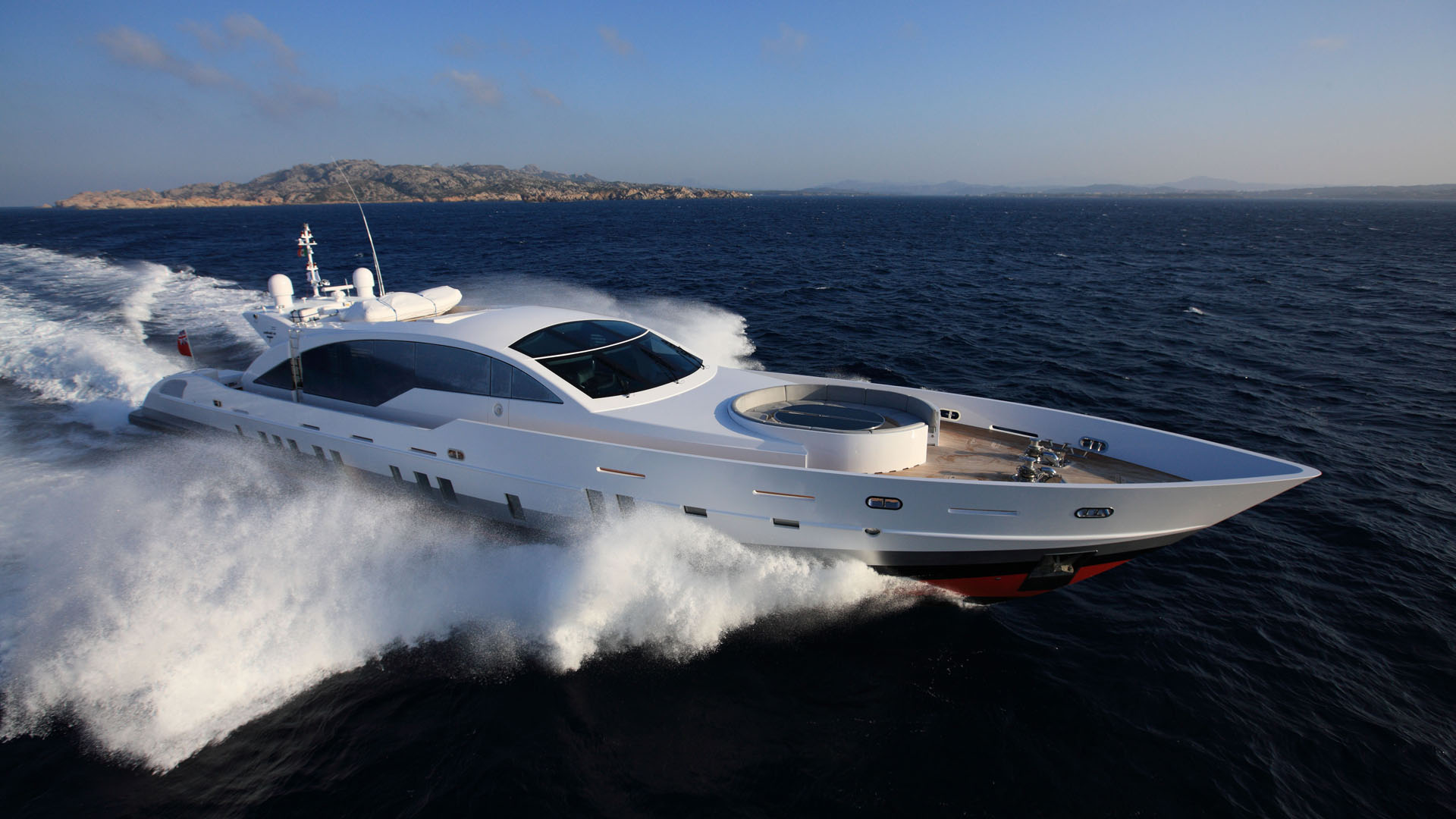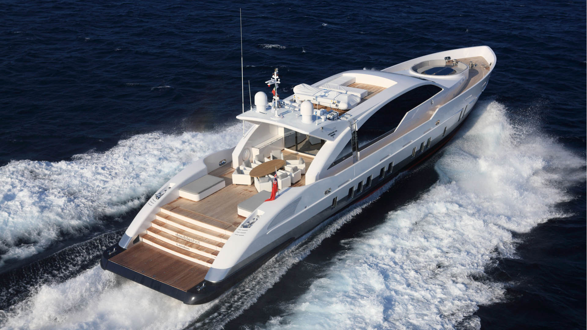 Designed by the Greek architect Ioanna Marinoupolos in collaboration with TECNOMAR Centro Stile, Double Shot is a 36-metre yacht of remarkable build quality. Her white hull is marked by three horizontal bands in red, blue, and silver, lending a unique signature to her profile. The sleek, lightweight form is accentuated by lowered bulwarks and expansive salon windows, which flood the interiors with natural light and offer uninterrupted views to the sea.