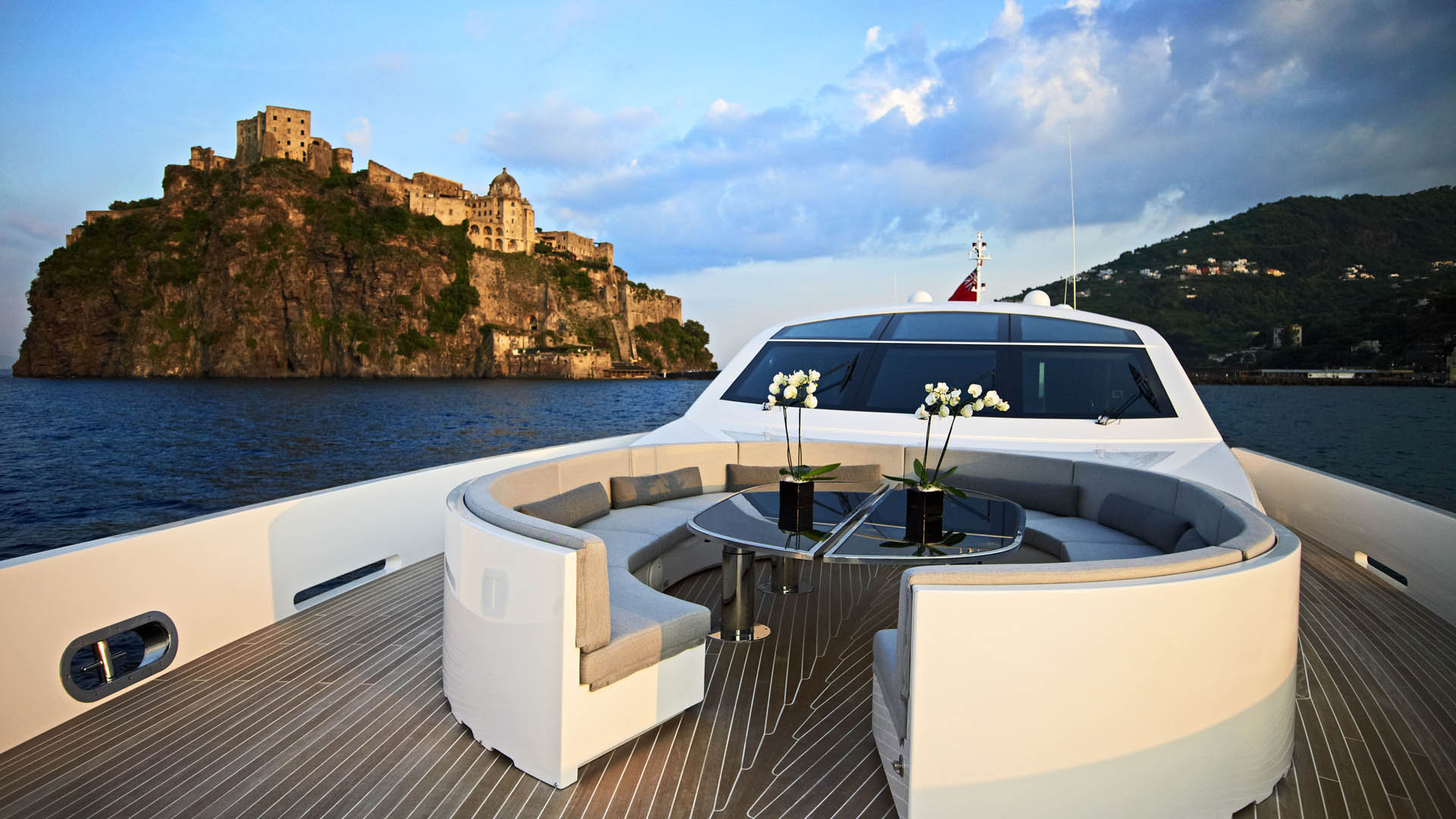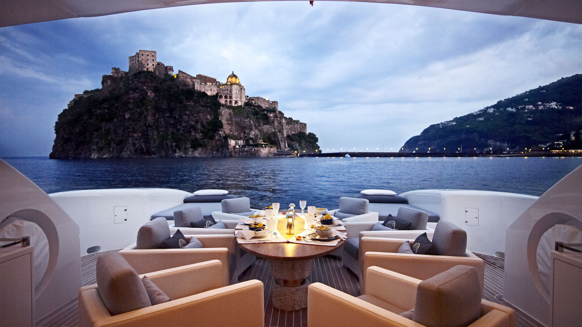 The exterior spaces are drawn to ensure direct connection with the sea and the utmost comfort for guests. Forward, a vast living area is furnished with table, sofas, and cushions, creating an inviting open-air salon. Aft, the grand cockpit opens dramatically onto the water, distinguished by a monumental stone dining table for eight and paired with two generous sun-lounges. A further private solarium is seamlessly integrated into the coachroof, invisible from the outside yet offering secluded repose. Completing the design, the broad staircase descending the stern is both scenic and functional, transforming the yacht into what may be described as a true “floating island.”