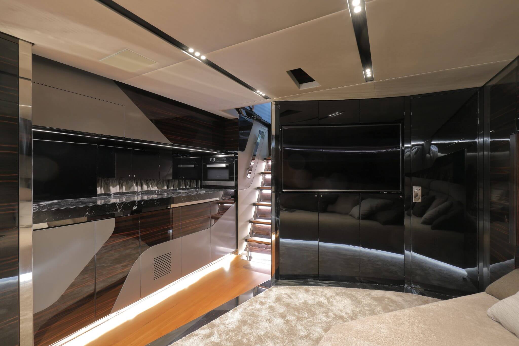 Below deck, the EVO 55 Open surprises with interiors inspired by superyachts. The first 55’ launched featured a layout with a forward Owner’s cabin with ensuite bathroom, and a convertible lounge — also with ensuite — which can be completely separated from the starboard galley.