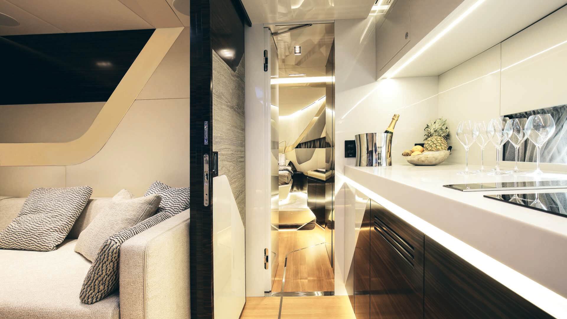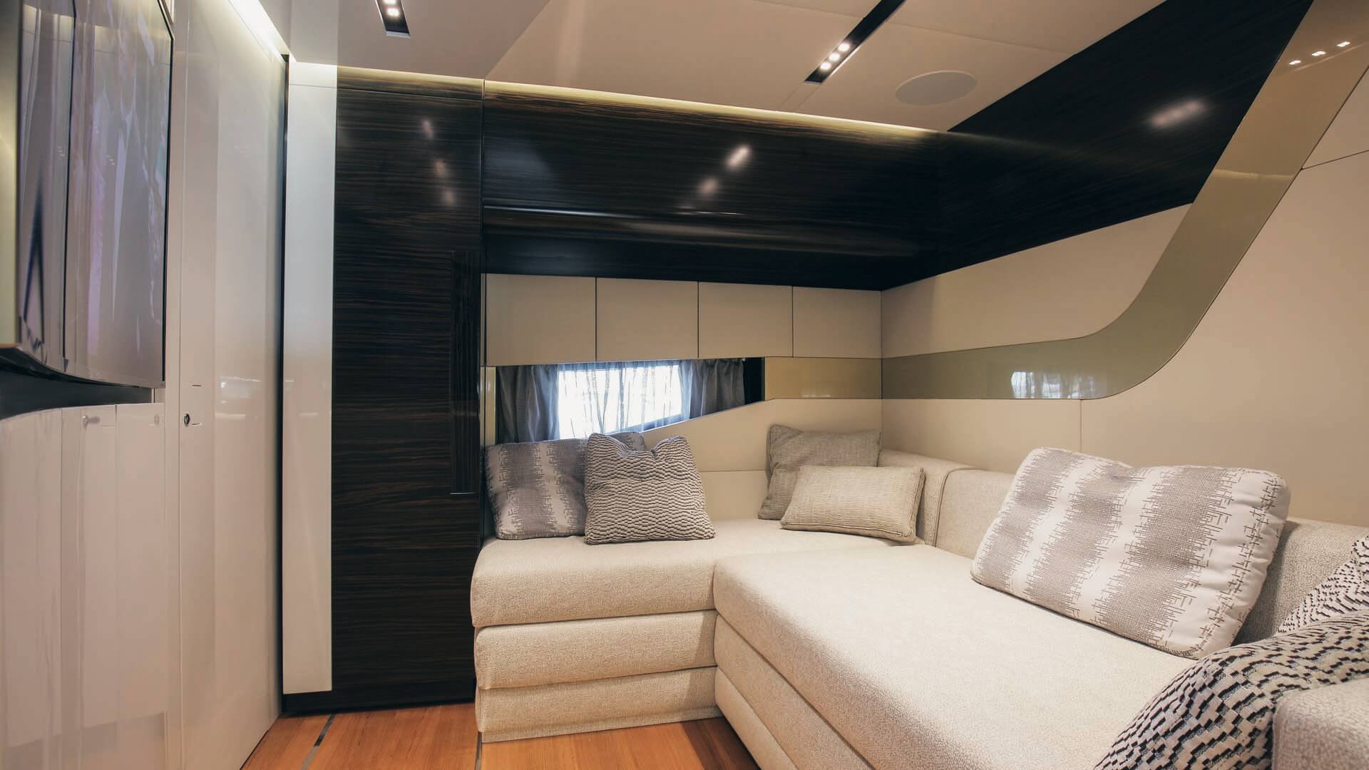 Every detail is carefully crafted, with precious materials and refined finishes enhancing the atmosphere. The result is an interior that is both sophisticated and welcoming, elevating compact dimensions into an exclusive experience in line with Tecnomar’s philosophy of elegance and performance.