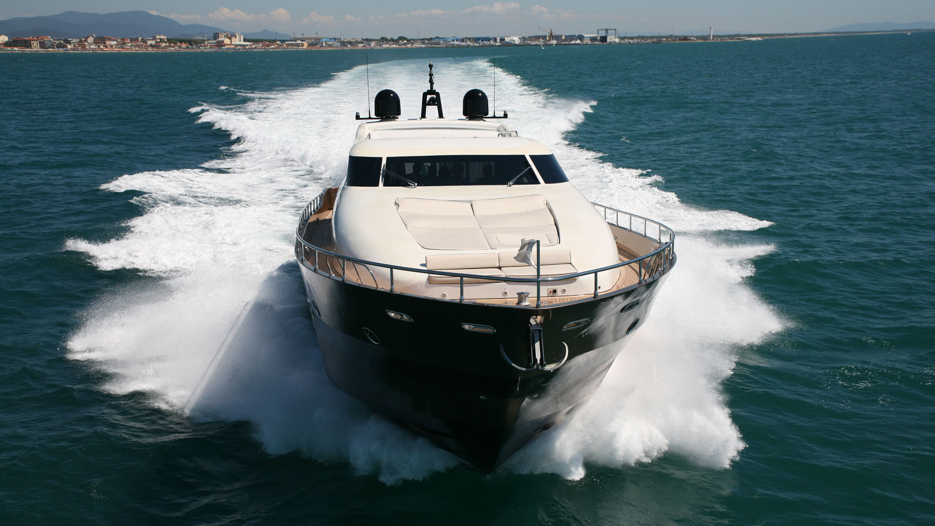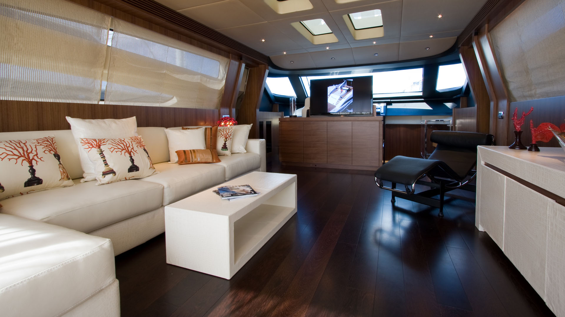 The exterior unfolds into a generously sized cockpit and living area. Double side windows, a wide front windshield, and a crystal-glass door flood the interior with natural light, creating a seamless connection between indoor elegance and open-sea splendor.