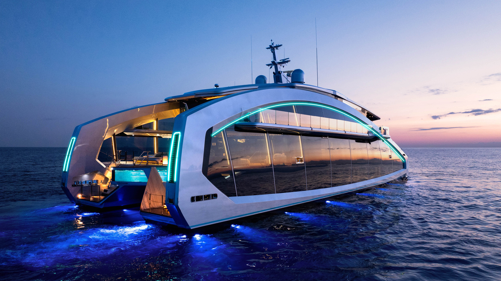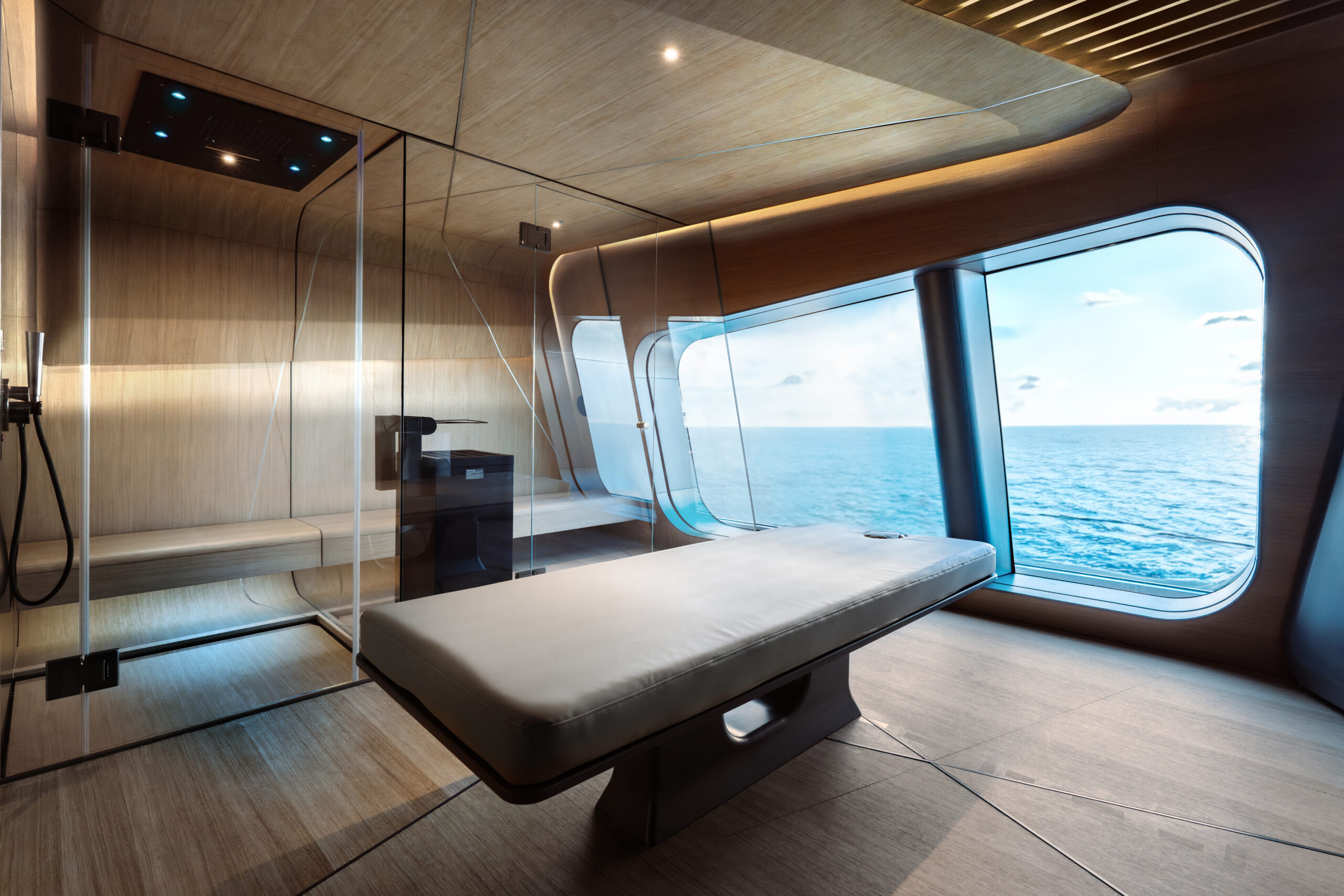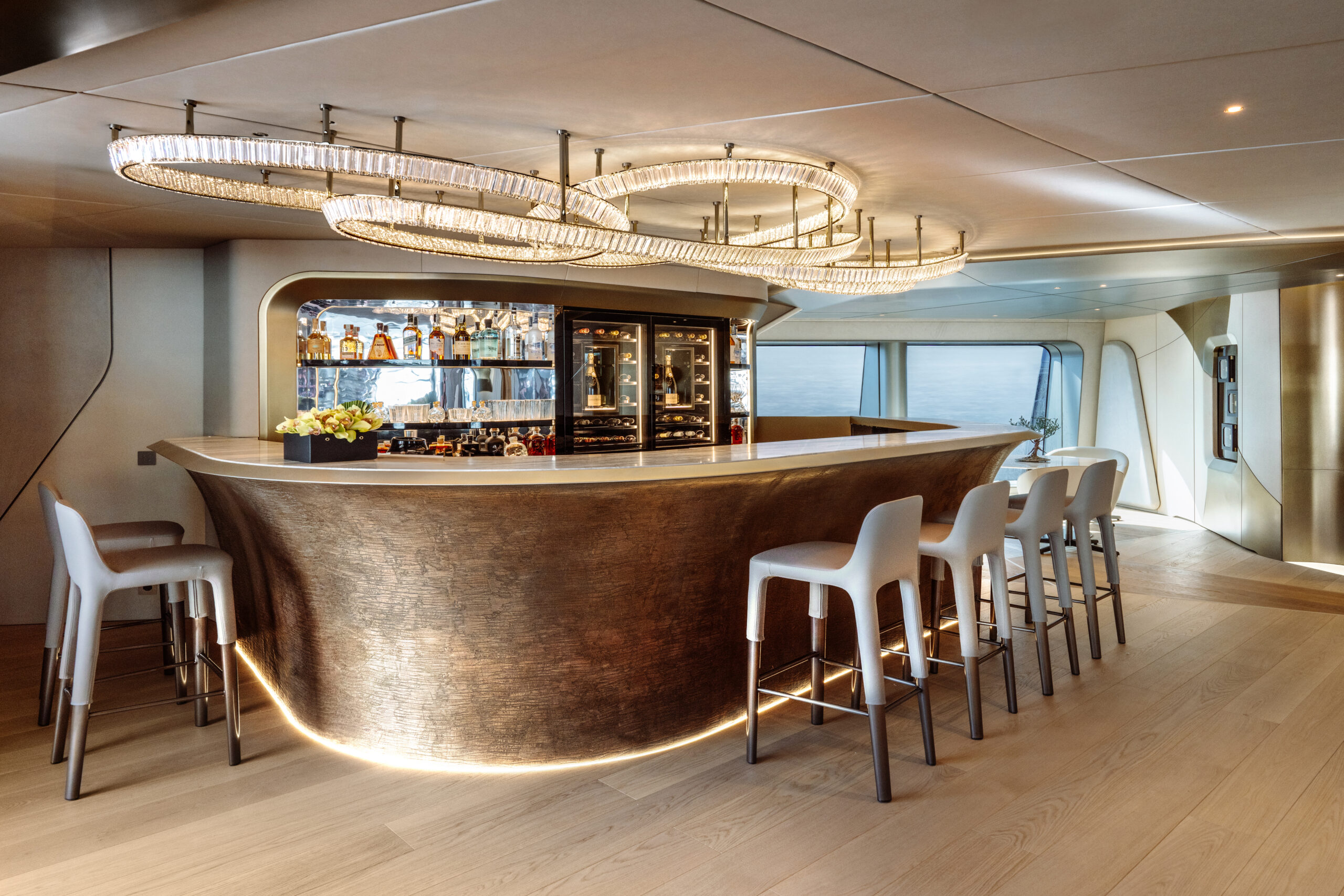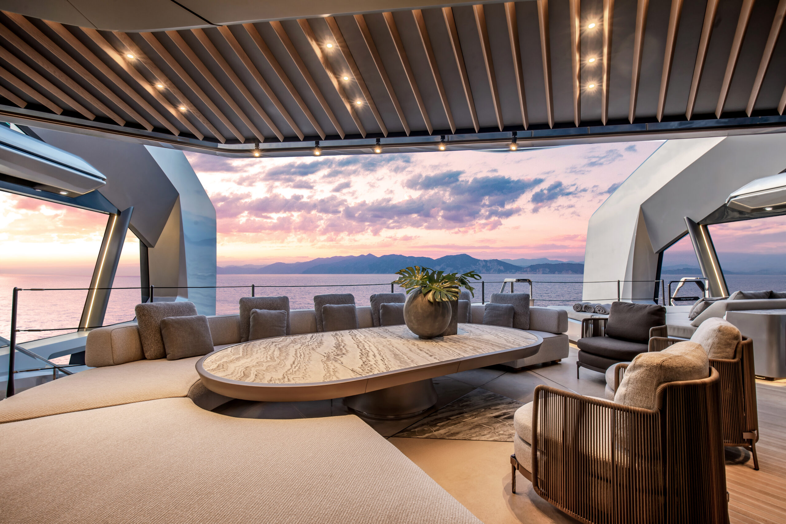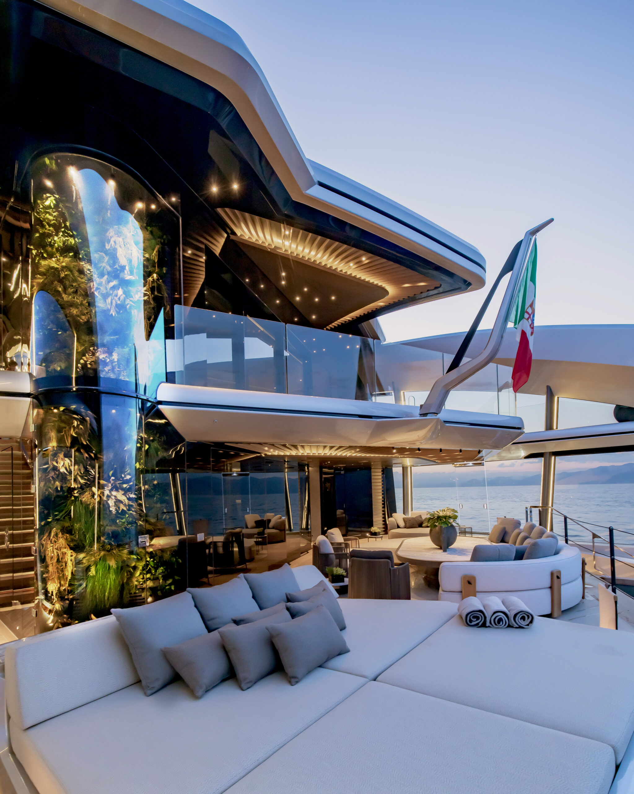 The aluminium superstructure, with its complex curved forms, pushed engineering to its limits, while weight control became a crucial triumph considering the vast glazed surfaces. Every deck is designed as both private and convivial, offering space for reflection as well as celebration.