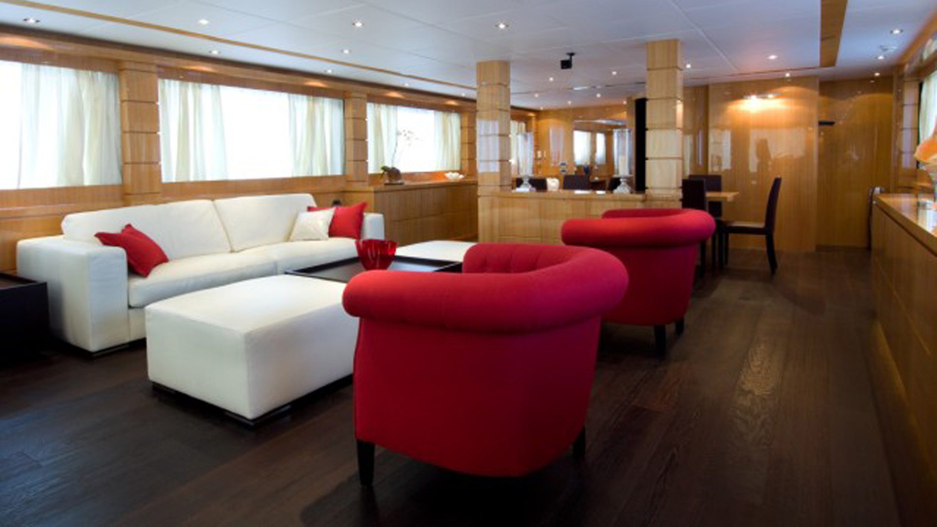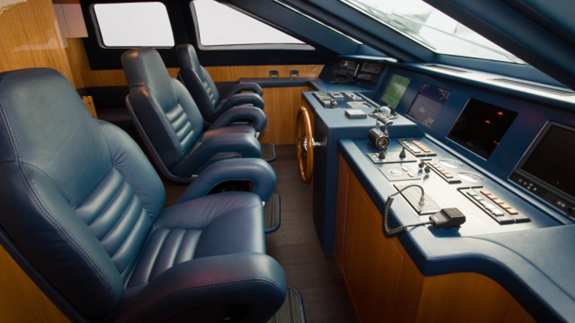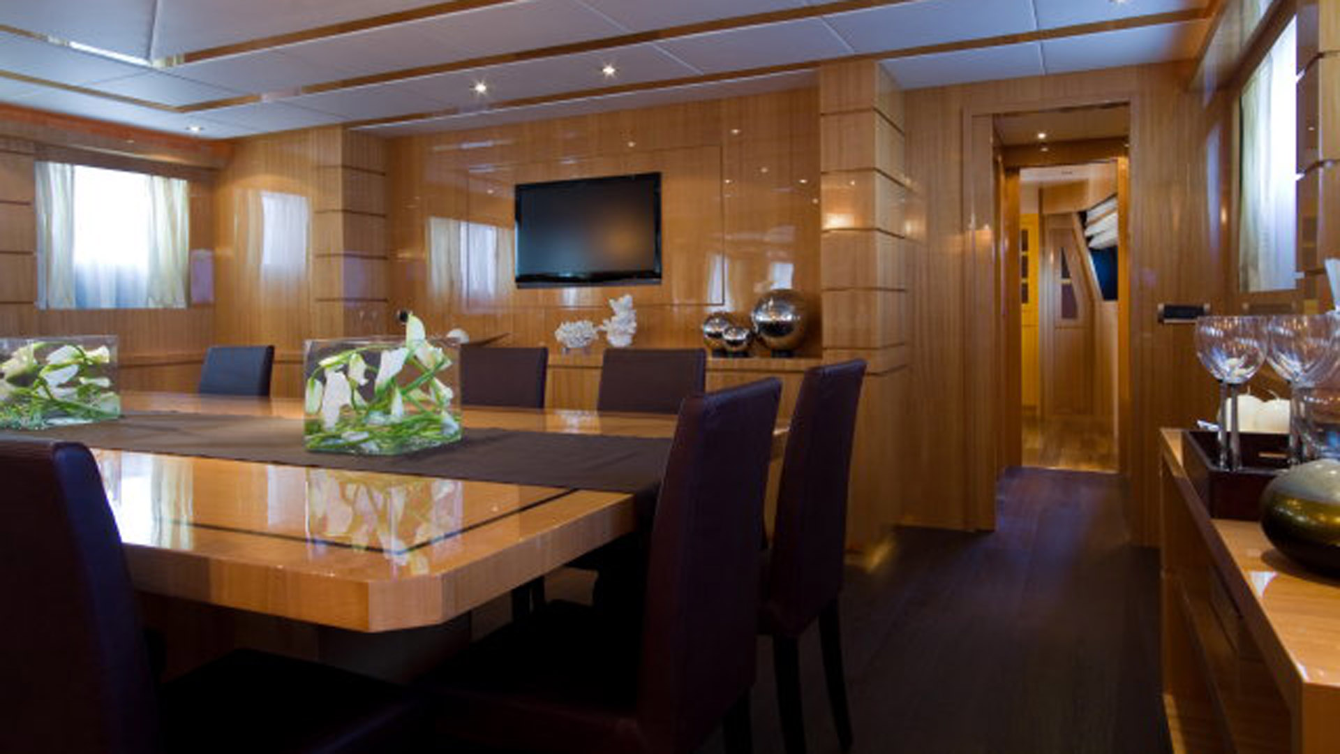 Inside, classic marine elegance meets warm mahogany and pear wood finishes, illuminated by natural light from large side windows. A sweeping spiral staircase links the decks with ease. The upper deck is largely dedicated to an Owner’s suite complete with private study and marble-appointed bathroom. In total, seven guest cabins, four doubles and two twins, accommodate up to 14 guests. Crew quarters for up to nine members include four cabins plus a dinette and service galley, supported by functional spaces such as a laundry with ironing room and a well-equipped main galley.