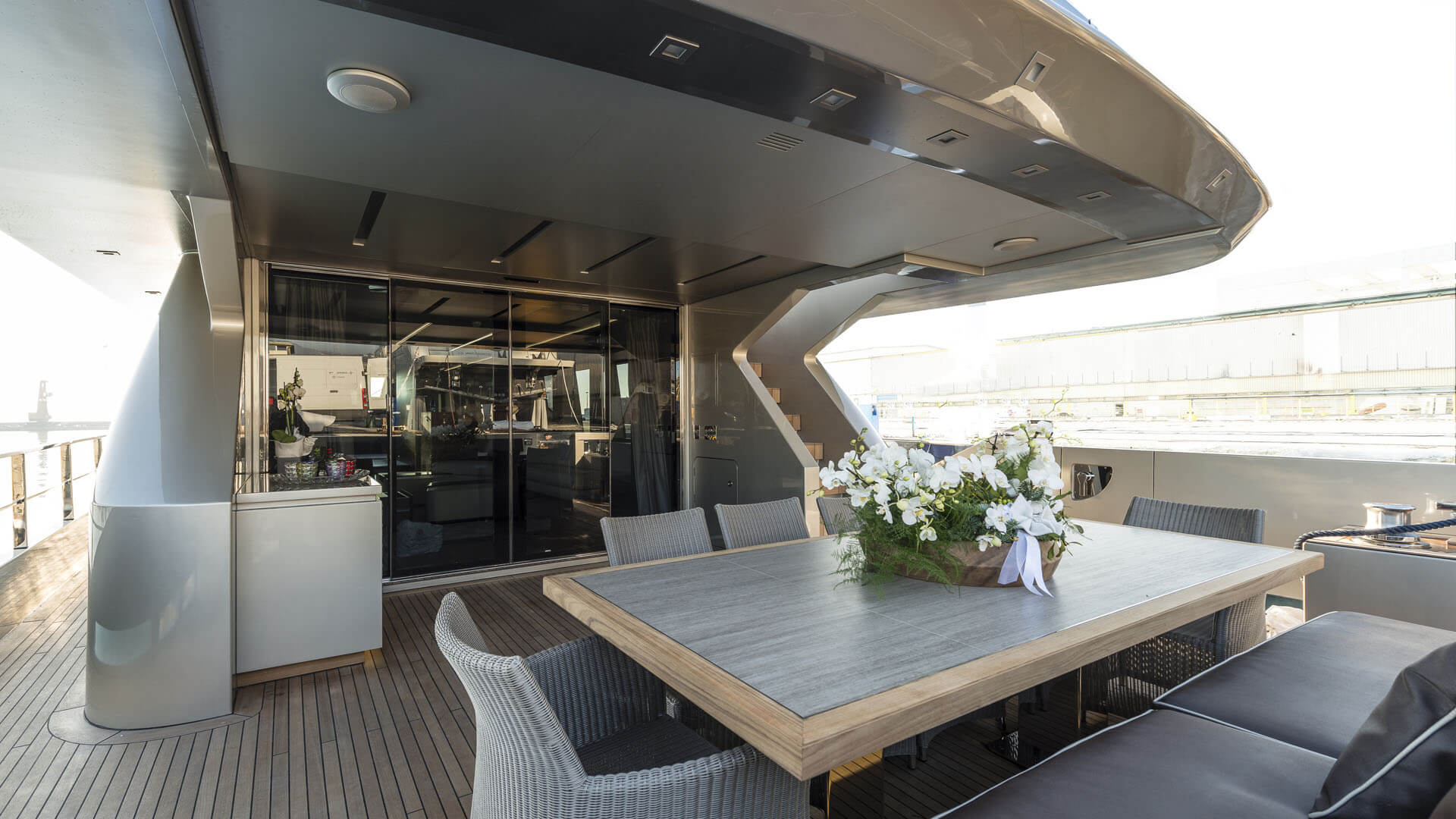 Conceived by TECNOMAR Centro Stile and meticulously tailored to the Owner’s wishes, Zahraa embodies a perfect accord of comfort, generous volumes, and artisanal finesse. Her interiors are distinguished by sophistication and an ingenious play of light. With lowered bulwarks and expansive glazing, natural daylight flows freely through the main deck and into every guest cabin.